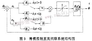 對于直流伺服系統(tǒng)的控制,采用加并聯(lián)微分通道對稱切換的滑?刂品椒苋〉昧钊藵M意的控制基于8098單片機(jī)的滑?刂扑欧到y(tǒng)熊茂華效果。滑?刂浦绷魉欧到y(tǒng)結(jié)構(gòu)如圖3所示。