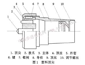 這種****是根據(jù)液性塑料夾具的原理,如圖1所示,它主要由主體3和錐柄7組成。主體3和錐柄7通過(guò)2個(gè)鍵6連接,并以外套5予以固定,在它們之間形成的空腔中充填著塑性好的塑料(它的配方為,聚氧乙烯樹脂百分之18,磷苯二甲酸二丁脂百分之80,硬脂酸鈣百分之2,再加上適量的錠子油配制,方法同塑料夾具相同)在錐柄的尾端用導(dǎo)柱8和調(diào)節(jié)螺絲10封閉起來(lái),在主體的頭端用頂針1和6個(gè)撥爪2封閉起來(lái),頂絲4可防止撥爪2轉(zhuǎn)動(dòng)。