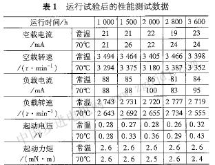 表l顯示了電機(jī)運(yùn)行不同時(shí)間后的性能測(cè)試結(jié)果?梢(jiàn),電機(jī)在常溫和高溫下進(jìn)行壽命試驗(yàn)l 000~3 600 h后,各性能數(shù)據(jù)仍然滿(mǎn)足表l所示的技術(shù)要求,說(shuō)明電機(jī)的使用壽命可達(dá)3 600 h以上,其常溫壽命比規(guī)定值提高80,高溫壽命提高l.4倍。