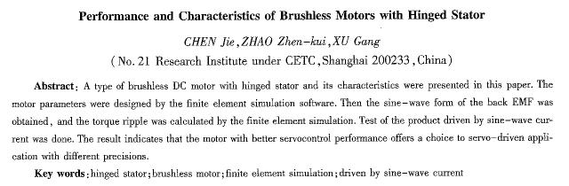 摘要:介紹了一種便于規(guī);a(chǎn)的定子鉸鏈式結構無刷電動機及其特點,利用有限元仿真軟件對電機參數(shù)進行了合理設計,從而獲得了正弦性較好的反電勢波形,并通過有限元仿真計算了電機轉矩波動。試驗結果表明,該電機采用正弦波電流驅動控制,具備了較好的伺服控制性能,為不同精度的伺服驅動應用場合提供了一個選擇。