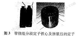 定子繞組設計為集中繞組,可方便地采用自動化繞線機機繞的方式將線圈繞在分段鐵心上,不同的鐵心拼接后壓人機殼即為電機的定子。本文設計為12槽10極,圖3為帶繞組的分段定子鐵心及拼裝后的定子。