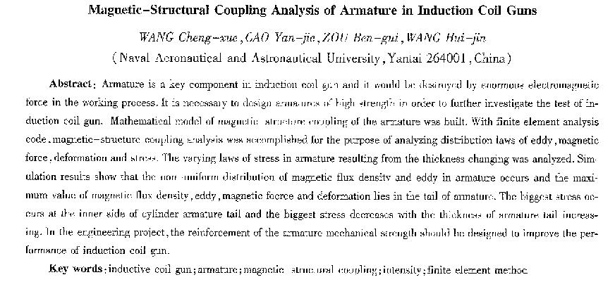摘要:電樞是感應(yīng)線圈炮的關(guān)鍵部件,其在工作過程中易發(fā)生破壞。為了設(shè)計(jì)高強(qiáng)度的電樞,以保證感應(yīng)線圈炮實(shí)驗(yàn)研究的順利進(jìn)行,建立了電樞磁結(jié)構(gòu)耦合過程的數(shù)學(xué)模型;用有限元仿真程序建立了感應(yīng)線圈炮的仿真模型,并對(duì)所建模型進(jìn)行了仿真,得到了電樞的渦流、電磁力、變形及應(yīng)力分布規(guī)律;分析了電樞后端部壁厚變化對(duì)電樞應(yīng)力的影響規(guī)律。結(jié)果表明:電樞的渦流密度、所受電磁力和結(jié)構(gòu)變形在電樞的后端部****,****應(yīng)力值位于電樞后端部?jī)?nèi)側(cè),并且隨著電樞壁厚的增加,電樞的****應(yīng)力值逐漸減小,故在設(shè)計(jì)電樞時(shí)其后端部應(yīng)采取加固措施以提高電樞的強(qiáng)度。