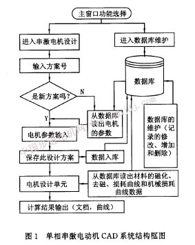 本文的單相串激電動(dòng)機(jī)cad軟件(系統(tǒng)結(jié)構(gòu)框圖見圖1),是基于windows98/nt環(huán)境下,用visual c++5,0開發(fā)的一種交互式軟件,并且包含數(shù)據(jù)庫管理系統(tǒng)。該軟件系統(tǒng)輸入數(shù)據(jù)方便、人機(jī)界面友好、操作方便、通用性強(qiáng),適合于生產(chǎn)廠家對電機(jī)的設(shè)計(jì)、分析和優(yōu)化。