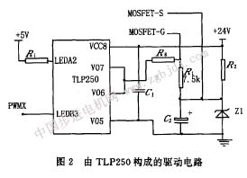 系統(tǒng)中元刷直流電動機(jī)采用分立元件構(gòu)成的逆變器驅(qū)動,逆變器中功率元件的驅(qū)動電路應(yīng)用了dsp的pwm輸出接口,以tlp250為隔離元件實現(xiàn)主電路與cpu的隔離,不導(dǎo)通功率器件的柵源之間具有5v的反向電壓,保證了功率器件的可靠關(guān)斷。驅(qū)動電路原理圖如圖2所示。