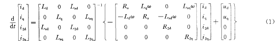 不考慮磁阻電機(jī)鐵磁飽和、磁滯和渦流的影響,定子三相繞組對稱。將電機(jī)轉(zhuǎn)子阻尼繞組以等效的d軸、口軸單回路表示,定子三相繞組等效為d軸、q軸繞組,得到dq0坐標(biāo)系中磁阻電機(jī)的電壓方程和轉(zhuǎn)子運(yùn)動方程。選擇定子、轉(zhuǎn)子軸電流。、轉(zhuǎn)子轉(zhuǎn)速和轉(zhuǎn)子位置角作為狀態(tài)變量,得到磁阻電動機(jī)的狀態(tài)方程。其中對應(yīng)于電壓方程的狀態(tài)方程為: