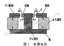 在這里僅從直線同多振蕩電動機的立場來考察場聲器。圖1是外磁型揚聲器的基本構(gòu)造。當(dāng)音圈中流過電流/(a),作用在音圈上的磁通密度為b(t)時,作用在線圈上的推力為f—bzi(n)。式中z為磁通密度作用范圍內(nèi)線圈的有效長度(m)。