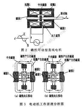 線圈1和線圈2相互之間作差動連接,電流從頻率可調(diào)的電源流人這兩個線圈,使驅(qū)動軸在z左右方向上振動。在圖3a中****磁鐵產(chǎn)生的磁通用虛表示。結(jié)圈中流過電流時產(chǎn)生的磁通用實線表示。當(dāng)電流為正時(參看圖2),在圖3a中磁鐵n極和極2之間的氣隙磁通增加,有很強的吸引力作用著,而另一方面,在磁鐵s極和極1之間的氣隙中,磁鐵磁通的線圈電流產(chǎn)生的磁通相抵消,吸引力大大減小。因此磁鐵就朝右方向移動。接著當(dāng)電流變?yōu)樨?fù)時,和上述分析方法相同,在圖3b中,磁鐵就向左方向移動,這就是這種振蕩電動機的工作原理。