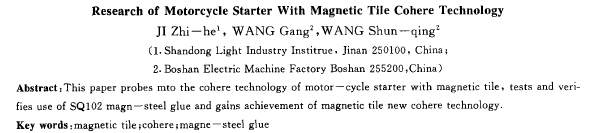 摘要:探討了摩托車起動(dòng)機(jī)磁瓦的粘接工藝,進(jìn)行了sq102磁鋼膠性能的驗(yàn)證,取得了磁瓦粘接新工藝的研究成果。