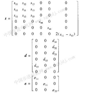 極化過的壓電陶瓷材料有類似六角晶系的對稱性,其柔度矩陣具有5個獨立的柔度系數(shù),壓電常數(shù)矩陣有3個獨立分量,介電常數(shù)矩陣有2個獨立分量。即: