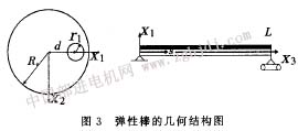主動棒的行為是sma加熱冷卻循環(huán)時應(yīng)力平衡的結(jié)果,平衡方程可產(chǎn)生撓度函數(shù),它是位置及sma轉(zhuǎn)變應(yīng)變的函數(shù)[4]。為簡化分析,考慮如圖3的彈性棒尺寸。sma平行于棒體軸線x3嵌入,距離該軸線d。sma加熱收縮,因為合金與棒中心軸不重合,所以由兩者表面剪力產(chǎn)生的彎矩可使棒體彎曲。第一次加熱冷卻循環(huán)的動作順序是: