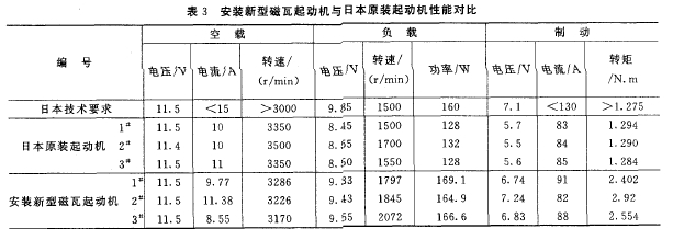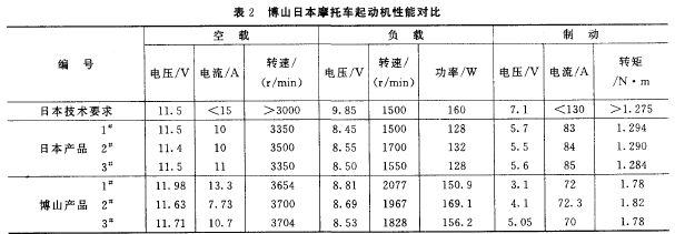 筆者在山東博山電機(jī)廠用釹鐵硼磁性材料作起動機(jī)磁瓦,生產(chǎn)的摩托車起重機(jī)性能達(dá)到并部分超過日本進(jìn)口產(chǎn)品,博山和日本進(jìn)口摩托車起動機(jī)性能對比見表2。