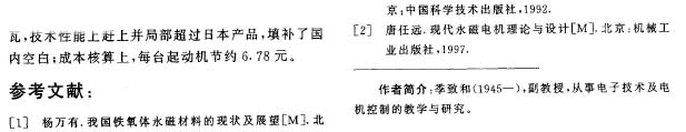 (4)經(jīng)濟(jì)效益進(jìn)一步提高。磁瓦角度改窄,重量減輕,降低磁瓦價格。由于角度減小,磁瓦毛坯利用率達(dá)********,每片磁瓦價格由原來的14元起初降至10元,后又降至6.5元。由于磁瓦夾角減小,磁場削弱,為確保磁性能滿足技術(shù)耍求,必須增加電樞繞組匝數(shù),用銅量由此增加1/6,成本增加0.22元。這樣每臺電機(jī)節(jié)省成本3.5×2-0.22-6. 78元,如以年產(chǎn)20萬臺計,可節(jié)省成本135萬元,經(jīng)濟(jì)效益相當(dāng)可觀。
