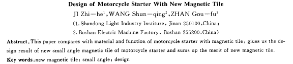 摘要:比較了中日摩托車起動機(jī)磁瓦的材料及性能,給出了新型摩托車起動機(jī)小角度磁瓦的設(shè)計結(jié)果,總結(jié)了新型磁瓦的優(yōu)點。