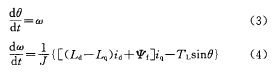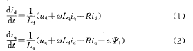 根據(jù)電路原理及電機(jī)統(tǒng)一原理,任何電機(jī)經(jīng)過(guò)適當(dāng)?shù)淖鴺?biāo)變換都可以寫(xiě)成統(tǒng)一的方程式。永磁伺服電機(jī)在與轉(zhuǎn)子同步旋轉(zhuǎn)的d-q坐標(biāo)系下的模型可寫(xiě)為: