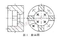 加工用胎具如圖1所示。為了節(jié)約材料,胎具加工一同車床主軸相聯(lián)接的錐孔,使胎具同車床主軸直接聯(lián)接,定心較準(zhǔn)。在試制時為了方便測量,胎具兩端為圓環(huán),中間為4條筋相聯(lián),使胎具結(jié)構(gòu)緊湊,剛性較好。