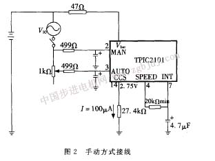 speed和int端用作低通濾波器的處理部分。當man端的連接是開路時,器件進入睡眠狀態(tài)。另外,器件可以抑制****2. 2v的源電壓偏移(v io)。手動方式的接線如圖2所示。