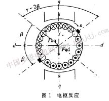 由此可見,在前半個(gè)極下,f。a為去磁,f為助磁,而在后半個(gè)極下f。d和f均為去磁。離磁極中心線距離越遠(yuǎn),去磁作用越強(qiáng)。