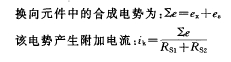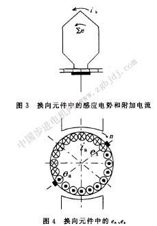換向是指元件通過電刷時(shí)元件中電流改變方向的過程,換向不良會(huì)產(chǎn)生火花。一般認(rèn)為火花產(chǎn)生的原因有三個(gè)方面,一個(gè)是電磁原因,一個(gè)是機(jī)械原因,而另一個(gè)是化學(xué)原因,其中主要為電磁原因。所謂電磁原因,是指換向時(shí),換向元件中存在感應(yīng)電勢(shì),產(chǎn)生附加電流(見圖3),該電流阻礙換向元件中電流方向的改變,產(chǎn)生火花。換向元件中的感應(yīng)電勢(shì)有自感電勢(shì)、互感電勢(shì)和換向元件切割交軸電樞反應(yīng)磁場(chǎng)產(chǎn)生的旋轉(zhuǎn)電勢(shì)。這些電勢(shì)的方向與換向前的電流方向相同阻礙換向(見圖4)。