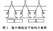 直流無刷起動(dòng)磁電機(jī)為內(nèi)定子結(jié)構(gòu),且要求結(jié)構(gòu)非常緊湊,電機(jī)軸向尺寸有限,若三相繞組采用雙層整距繞組,繞組端部會(huì)較高,在有限空間內(nèi)將不得不減小鐵心有效長度,繞組端部的周向長度比繞組軸向長度長很多,繞組利用率低。因此,設(shè)計(jì)中采用了圖2所示方案,即每對(duì)磁極下有3個(gè)齒,每相1個(gè)齒,每個(gè)齒上套一相集中繞組,三相繞組在空間上不存在重疊區(qū)域。繞組實(shí)際跨距在電磁上不超過120度電角度,繞組系數(shù)較低,電磁轉(zhuǎn)矩脈動(dòng)量較大;但電機(jī)生產(chǎn)加工工藝簡單,在有限空間內(nèi),能有效降低繞組端部高度,增加鐵心有效長度。