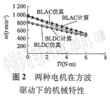 bldcm的額定轉(zhuǎn)速560 r/min,額定轉(zhuǎn)矩4 n·m。運(yùn)行于兩相導(dǎo)通星形三相六狀態(tài)120o導(dǎo)通方式,blacm除r其反電勢(shì)波形與bldcm不一樣外,其他參數(shù)都相同。圖2給出了兩種電機(jī)機(jī)械特性的仿真與計(jì)算曲線,blacm的機(jī)械特性計(jì)算結(jié)果與仿真結(jié)果相近,說(shuō)明等效計(jì)算是合理的。但由于沒(méi)有考慮電感對(duì)機(jī)械特性的影響,仿真結(jié)果和計(jì)算結(jié)果之間存在著一定的誤差。