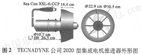 圖2為tecnadyne公司的2020型集成電機(jī)推進(jìn)器外形圖。這種結(jié)構(gòu)的imp將電機(jī)控制器、推進(jìn)電機(jī)、減速器集成在一個(gè)密封的殼體中沿軸向依次排列,再通過(guò)減速器的輸出軸帶動(dòng)螺旋槳,由于使用了減速器,推進(jìn)電機(jī)的轉(zhuǎn)速可以設(shè)計(jì)得較高,進(jìn)而縮小imp整體外形尺寸,提高功率密度。工作時(shí),外部只需通過(guò)防水電纜向其提供工作電源和轉(zhuǎn)速控制信號(hào)即可。