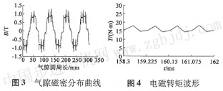 圖6和圖7分別給出了內(nèi)置切向式轉(zhuǎn)子結(jié)構(gòu)電機(jī)在額定負(fù)載下,穩(wěn)態(tài)運(yùn)行時(shí)氣隙磁密分布曲線和電磁轉(zhuǎn)矩波形。圖8為某一時(shí)刻電機(jī) |