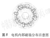 在完成初步設(shè)計(jì)后,利用有限元方法對(duì)電機(jī)進(jìn)行了性能分析和電磁場(chǎng)計(jì)算。圖3和圖4分別給出了額定負(fù)載下電機(jī)穩(wěn)態(tài)運(yùn)行時(shí)氣隙磁密分布曲線和電磁轉(zhuǎn)矩波形。圖5為某一時(shí)刻電機(jī)內(nèi)部磁場(chǎng)分布示意圖。