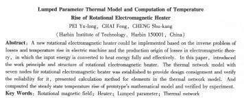 摘要:旋轉(zhuǎn)電磁致熱器是從電機(jī)損耗與溫升的逆問題出發(fā),將通常意義上的損耗轉(zhuǎn)化為可利用熱能的裝置。文章介紹了旋轉(zhuǎn)電磁致熱器的結(jié)構(gòu)及工作原理,根據(jù)其結(jié)構(gòu)建立了7節(jié)點的集中參數(shù)熱網(wǎng)絡(luò)模型,給出了熱網(wǎng)絡(luò)模型中關(guān)鍵熱阻參數(shù)的計算方法,并建立了其等效的集中參數(shù)熱網(wǎng)絡(luò)方程。針對一臺實際樣機(jī),計算了其熱阻參數(shù)及穩(wěn)態(tài)運(yùn)行時致熱器的內(nèi)部溫升,而相應(yīng)的實驗驗證了其有效性。