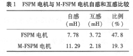 表l對比了具有同樣電機外徑和繞組匝數(shù)的2臺fspm電機與m-fspm電機的自感和互感情況。通過對比可以發(fā)現(xiàn),互感與自感的比例由fspm電機的近47.8 010降低到了m-fspm電機的百分之19. 3,所提出的電機在磁路獨立性方面的性能提升較為明顯。