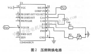 系統(tǒng)通過調(diào)整電機的驅(qū)動頻率實現(xiàn)轉(zhuǎn)速控制,電路如圖2所示。調(diào)頻電路采用內(nèi)部帶有壓控振蕩器(vc0) cd4046產(chǎn)生方波信號,電路可以方便的實現(xiàn)頻率調(diào)節(jié),線路結(jié)構(gòu)簡單,在整個頻率段均可獲得很好的穩(wěn)定性。vc0振蕩頻率的范圍由rl、r2和ci決定。