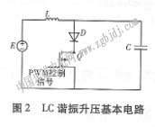 由于超聲波電機一般在機械諧振點和反諧振點之間運行,電機對外呈容性,可忽略阻抗很大的串聯(lián)之路的影響,略去等效電阻r。由于mos—fet內(nèi)部有一個反并聯(lián)體二極管,在電容c電壓反相時會通過此二極管放電,使得輸出電壓只有正半波。為了防止這種情況出現(xiàn),在電路串聯(lián)一個超快恢復二極管,使得在開關(guān)斷開期間lc能形成完整的振蕩。使用boost升壓lc諧振電路如圖2所示。