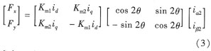 式中:θ為轉子位置機械角;iα1、iβ2為靜止坐標系下懸浮繞組等效兩相電流。