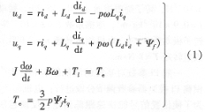 電機(jī)采用轉(zhuǎn)子表面安裝( spm)永磁體結(jié)構(gòu)電機(jī)系統(tǒng)在d-q坐標(biāo)系下的數(shù)學(xué)模型為[3,4]