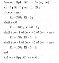 模糊控制模塊采用simulink內(nèi)嵌的可編程模塊,通過(guò)matlab編程來(lái)實(shí)現(xiàn)。這種編程實(shí)現(xiàn)與直接采用simulink中現(xiàn)成的模糊控制模塊相比,具有自由度大、方便等優(yōu)點(diǎn)。其模塊內(nèi)部程序代碼為: