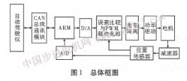 該數(shù)字舵機(jī)控制器的基本原理是:自動(dòng)駕駛儀通過(guò)can總線(xiàn)將操舵信號(hào)以數(shù)字形式發(fā)送給舵機(jī)控制器并監(jiān)控舵機(jī)的位置狀態(tài),舵機(jī)控制器對(duì)舵機(jī)的位置進(jìn)行采樣并與操舵信號(hào)比較以合適的控制算法進(jìn)行處理,輸出pwm信號(hào)控制電機(jī),從而組成閉環(huán)實(shí)現(xiàn)對(duì)舵機(jī)的控制。其總體框圖如圖1所示。