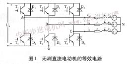 由于元刷直流電動機的氣隙磁場、反電動勢以及電流是非正弦的,采用直、交軸坐標變換已不是有效的分析方法。假設三相繞組完全對稱,忽略電機中的磁滯和渦流損耗,不計電樞反應對氣隙磁通的影響?傻萌酂o刷直流電動機的等效電路如圖1所示。