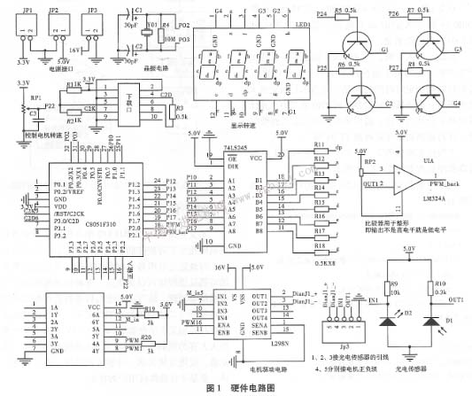 通過調(diào)節(jié)電位器來控制電機的轉(zhuǎn)速,即通過調(diào)節(jié)電位器rp改變輸入到端口p2.2的模擬電壓,再通過c8051f310單片機內(nèi)部的a/d轉(zhuǎn)換,并轉(zhuǎn)換成一定占空比的pwm信號,從端口p2.0輸出到hd74hc04p進行反相,以增大pwm信號的驅(qū)動能力,然后再輸出到電機驅(qū)動芯片l298來控制電機的轉(zhuǎn)速,之后再利用光電傳感器和碼盤來采集電機轉(zhuǎn)動時產(chǎn)生的脈沖信號,但該波形是連續(xù)的模擬信號,單片機不易處理,故再將4運放集成電路lm324接成比較器的功能,然后將這組脈沖波形輸出到lm324的2腳,再通過調(diào)節(jié)電位器rp2,就可以得到一組單片機容易處理的、且能反映電機轉(zhuǎn)速的方波信號pwm_ back,再將pwm_back輸入到端口p2.1,并利用定時器0的計數(shù)功能。來計算端口p2.1在采樣周期t內(nèi)的脈沖個數(shù)。最后再通過公式(1),求出電機的轉(zhuǎn)速并通過l數(shù)碼管實時地顯示出來。