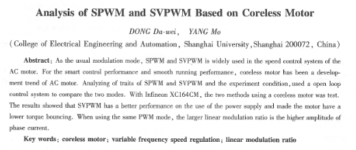 摘要:正弦脈寬調(diào)制( spwm)與空間矢量脈寬調(diào)制(svpwm)都是目前常用的調(diào)制模式,被廣泛應(yīng)用于各種交流電機的調(diào)速系統(tǒng)中?招谋姍C,由于其便捷的控制特性,作為高性能的傳動機構(gòu),代表了交流電機的發(fā)展方向之一。理論分析兩種調(diào)制方法的特點,并通過分析試驗條件,提出在開環(huán)變頻的條件下對兩種調(diào)制方法進行比較。摹于英飛凌xc164cm完成了軟、硬件試驗平臺的建立,通過對空心杯電機進行變頻調(diào)速來比較兩種調(diào)制方法。試驗結(jié)果表明,采用svpwm可以提高電源的利用效率,有效減小電機的脈振;在穩(wěn)態(tài)時,對于同一種調(diào)制方式的線性調(diào)制比越大,相電流的幅值越大。