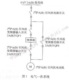 設(shè)計方案是對a、b引風(fēng)機(jī)作了“一拖一”的變頻改造,變頻器型號為dhvectol-di03150/06,生產(chǎn)廠家為成都東方日立。其電氣一次系統(tǒng)圖如圖1所示。