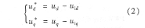 上述數(shù)學(xué)模型中,ea、eb、ec和ia、ib、ic之間存在耦合,為了更加清晰地了解各個(gè)變量之間的關(guān)系,利用坐標(biāo)變換理論,將三相靜止坐標(biāo)系下的數(shù)學(xué)模型變換到二相同步旋轉(zhuǎn)( d-g)坐標(biāo)系下,其中d軸與電網(wǎng)三相相電壓合成矢量同向,并以角速度m逆時(shí)針旋轉(zhuǎn)。二相同步旋轉(zhuǎn)坐標(biāo)系下的數(shù)學(xué)模型為: