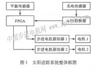 該系統(tǒng)所設(shè)計(jì)出的系統(tǒng)架構(gòu),使用兩臺(tái)步進(jìn)電機(jī)作為驅(qū)動(dòng)源來設(shè)計(jì)出追日性能良好的太陽追蹤裝置,此機(jī)構(gòu)為能做接近半球面立體轉(zhuǎn)動(dòng)的太陽能發(fā)電系統(tǒng)。系統(tǒng)框圖如圖1所示。