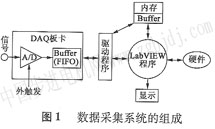 daq采集卡通?梢酝瓿赡#瘮(shù)轉(zhuǎn)換、數(shù)/模轉(zhuǎn)換、數(shù)字量輸入/輸出、以及計(jì)數(shù)器/定時(shí)器操作等多種功能。使用之前,因其控制程序用到了許多底層的daq驅(qū)動(dòng)程序,必須對(duì)daq卡的硬件進(jìn)行配置。而labview的數(shù)據(jù)采集程序庫(kù)包括了ni公司許多數(shù)據(jù)采集卡的驅(qū)動(dòng)控制程序,無(wú)需再自己開發(fā)驅(qū)動(dòng)控制程序。數(shù)據(jù)采集系統(tǒng)的組成如圖1所示。