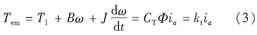 式中:tem為電磁轉(zhuǎn)矩;t1為負載轉(zhuǎn)矩;b為阻尼系數(shù);j為轉(zhuǎn)動慣量;k1為轉(zhuǎn)矩常數(shù)。