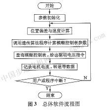其系統(tǒng)的總體軟件設(shè)計流程圖如圖3所示。在電機(jī)的模糊控制表形成過程中,隔一段時間給定電機(jī)不同的速度,以根據(jù)采集到的電機(jī)轉(zhuǎn)速變化曲線通過遺傳算法部分的程序,自動計算出控制器參數(shù)的****化結(jié)果,然后待控制器參數(shù)較為穩(wěn)定時,可以將遺傳算法優(yōu)化部分程序跳過執(zhí)行,使系統(tǒng)成為單純模糊控制系統(tǒng),從而達(dá)到加快上位機(jī)運(yùn)行速度,減少控制器參數(shù)設(shè)計中人工開支的作用。