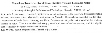 本文提出了一種新型的具有磁阻式直線旋轉(zhuǎn)步進(jìn)電機(jī)的結(jié)構(gòu),其旋轉(zhuǎn)力矩和直線力矩均由徑向磁場產(chǎn)生,因此稱為雙徑向磁阻式直線旋轉(zhuǎn)步進(jìn)電機(jī)。并對電機(jī)的直線運動徑向磁場進(jìn)行了分析,建立了等效磁路結(jié)構(gòu),計算了一個齒距內(nèi)不同位置的氣隙磁阻,并根據(jù)建立的磁路結(jié)構(gòu)進(jìn)行了仿真,結(jié)果表明這種磁場形式的直線運動具有一般感應(yīng)式直線步進(jìn)電機(jī)的優(yōu)良特性。