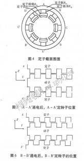 定子截面如圖4所示。徑向磁場直線運動時,當(dāng)一對主極下如a-a通電時,轉(zhuǎn)子齒與定于a-a磁極對齊如圖5,相鄰的b-b磁極與轉(zhuǎn)子相差1/p齒距(p為極對數(shù))如圖6所示,當(dāng)通電方式由a-a,轉(zhuǎn)到b-b,時,轉(zhuǎn)子移動1/p個齒距,實現(xiàn)了直線運動。同樣也可以兩相繞組通電,直線移動距離為1/2p。