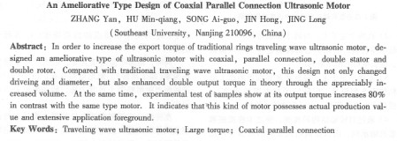 摘要:為提高傳統(tǒng)環(huán)形行波型超聲波電機的輸出轉(zhuǎn)矩,研制了一種改進(jìn)型共軸并聯(lián)式雙定子雙轉(zhuǎn)子超聲波電機。與傳統(tǒng)行波型超聲波電機相比,這一電機在保證驅(qū)動電源和直徑不變的基礎(chǔ)上,通過略微增加的體積,將輸出轉(zhuǎn)矩在理論上增加一倍。同時,通過對這種電機的樣機進(jìn)行實驗檢測,輸出轉(zhuǎn)矩較同型號超聲波電機增加百分之80,表明該電機具有實際生產(chǎn)價值和廣闊的應(yīng)用前景。