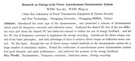 摘要:介紹了測功機的主要種類,并選擇利用變頻器與異步電機實現(xiàn)異步電力測功機的方案。分析了共用直流母線的兩種不同方式,并選擇共用直流均衡母線的方式把兩臺變頻器的直流母線并聯(lián)以實現(xiàn)能量的回饋利用。介紹了直接轉(zhuǎn)矩控制的基本原理,并利用直接轉(zhuǎn)矩方式來實現(xiàn)對異步電機的控制,在此基礎(chǔ)上,通過采用直接轉(zhuǎn)矩控制方式對測功機系統(tǒng)進行了大量的仿真研究,驗證可知該異步電力測功機系統(tǒng)具有良好的動、靜態(tài)性能,并達到了能量回饋的目的。