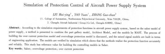 摘 要:針對某型飛機電源系統(tǒng)保護控制的仿真需求,在飛機主電源和二次電源的saber模型基礎(chǔ)上,提出了器件庫模型、模型構(gòu)建工具model aichitect中的模型以及mast語言編程模型相結(jié)合的方法,詳細論述了saher仿真器中過壓保護和過流保護控制模型的建模過程,從工程應(yīng)用的角度建立了相應(yīng)的混合信號仿真模型,并對控制模型的功能進行仿真驗證。仿真結(jié)果表明,該方法能準(zhǔn)確、可靠地實現(xiàn)電源系統(tǒng)模型的保護控制功能,為今后運用saber仿真器建立控制模型提供了有益參考。