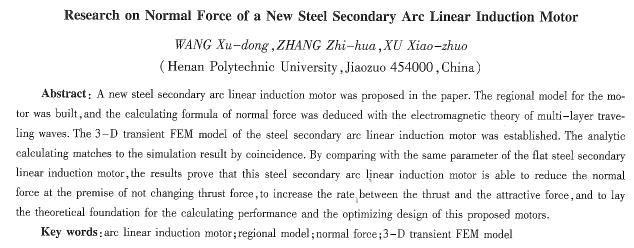 摘要:提出一種新型鋼次級弧形直線感應電動機,采用多層行波電磁場理論建立該電機的區(qū)域模型,推導出法向力計算公式,建立該鋼次級弧形直線感應電動機三維瞬態(tài)有限元仿真模型,仿真結果與解析計算結果相吻合。并與同參數的扁平形鋼次繳直線感應電動機作比較,結果表明這種鋼次級弧形直線感應電動機在不改變推力的前提下能夠減少法向吸力,提高推力與吸力比值,為該類電機的性能計算、優(yōu)化設計奠定理論基礎。
